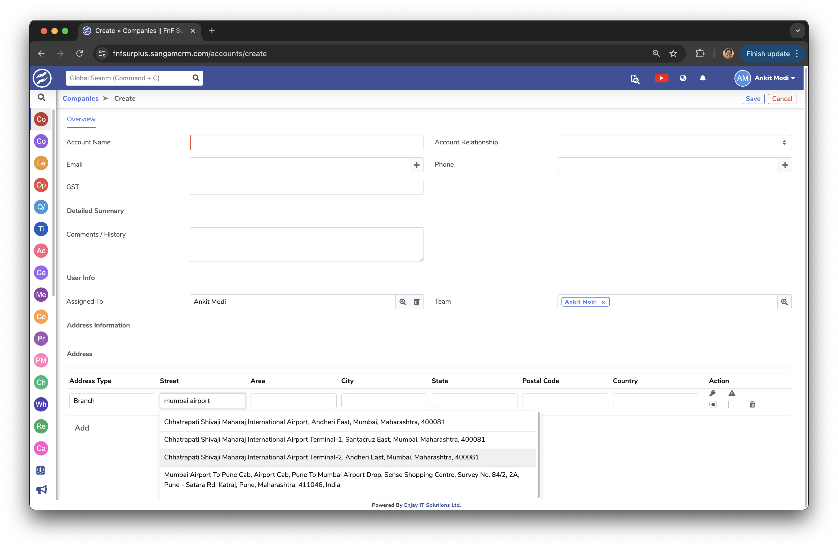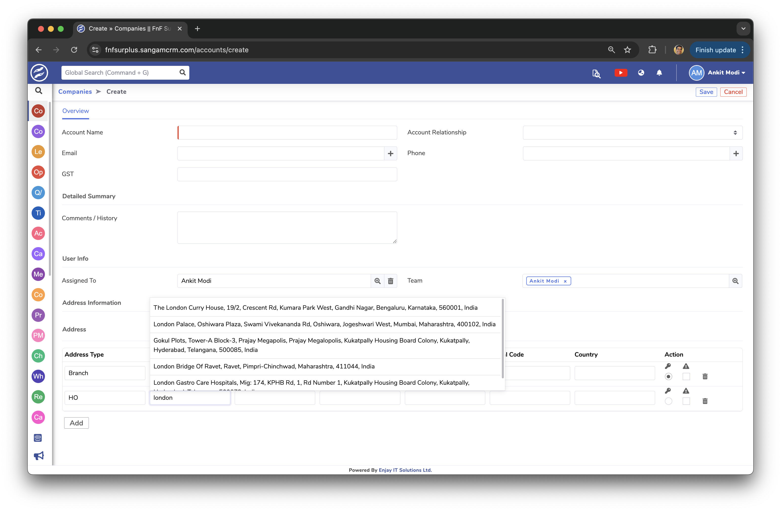 When adding an address in accounts, then the full address of Indian location is automatically fetched from Google maps but not for international locations.